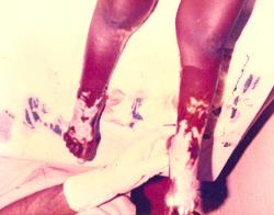 | Both of little Evonnie's legs were badly burned when she turned a pot of boiling rice over. |